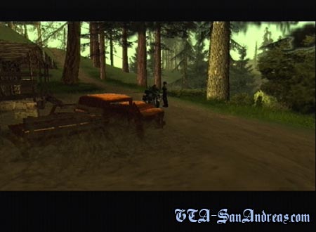 Jump on the Sanchez dirt-bike parked nearby and make your way up the mountain. Start at the red marker at the bottom, then follow the dirt path up and around to the left and eventually you'll come to a small forest.