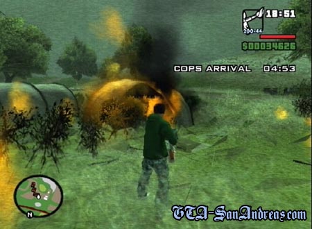 Carl pays The Truth for Tenpenny's drugs a few missions ago, and TT tells CJ his stuff is in the truck. Carl is amazed to find there's over 2 tons of weed in there, but a police chopper overhead is enough to stop them talking. The cops are on their way and The Truth wants you to help him burn the rest of the weed with a flamethrower. Make your way over to the weed field and start flaming. You need to burn all of the fields marked with red dots on the radar, but you also need to avoid the fire, or Carl will die a horrible fiery death. Run towards the weed, hold R1 to aim the flamethrower, then push L1 or circle to shoot. Keep flaming until it catches fire, and a lot of black smoke is emitted. Move along to other patches of weed and keep shooting. You can smash the glass by flaming them for a few seconds. Just keep moving from one place to another and burning everything until it's gone. If you run out of ammo you'll find some more by the farm. Use it to take out the rest of the weed then get back over to The Truth. You may find this mission a bit easier after completing 12 levels in the Firefighter missions as you'll be fireproof, and catching fire will cause you no harm, however it's just as easy to keep out of the way. Alternatively, if you have any satchel charges left from Catalina's missions, throw those down on the ground in the weed and blow them up. They'll take out about quarter of a row each time which is a quick way to get rid of it if you don't have much time left. After you've burned them and spoken to The Truth he'll give you a rocket launcher and tell you to take down the chopper above, so aim upwards and take it down. Once it's gone, get in the mothership. You'll need to drive The Truth into San Fierro to a garage in his weed van, so plan your route from Back O Beyond into San Fierro. Make your way to the garage in Doherty and park in the red circle.